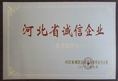 2012年9月26日上午,在河北省石家莊市召開了2012年“河北省企業(yè)誠(chéng)信建設(shè)經(jīng)驗(yàn)交流會(huì)”暨“河北省誠(chéng)信企業(yè)”授牌儀式。我公司被評(píng)為2012年“河北省誠(chéng)信企業(yè)”,公司董事長(zhǎng)、總經(jīng)理王振剛被評(píng)為“河北省企業(yè)誠(chéng)信建設(shè)優(yōu)秀工作者”。河北省整頓和規(guī)范市場(chǎng)經(jīng)濟(jì)秩序領(lǐng)導(dǎo)小組辦公室、河北省誠(chéng)信企業(yè)評(píng)選委員辦公室、河北省企業(yè)家協(xié)會(huì)聯(lián)合對(duì)獲獎(jiǎng)企業(yè)予以表彰,并頒發(fā)了證書。誠(chéng)信是企業(yè)生存的根本,誠(chéng)信是企業(yè)發(fā)展的法寶。