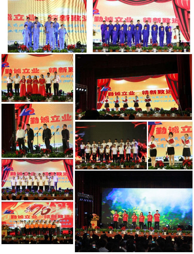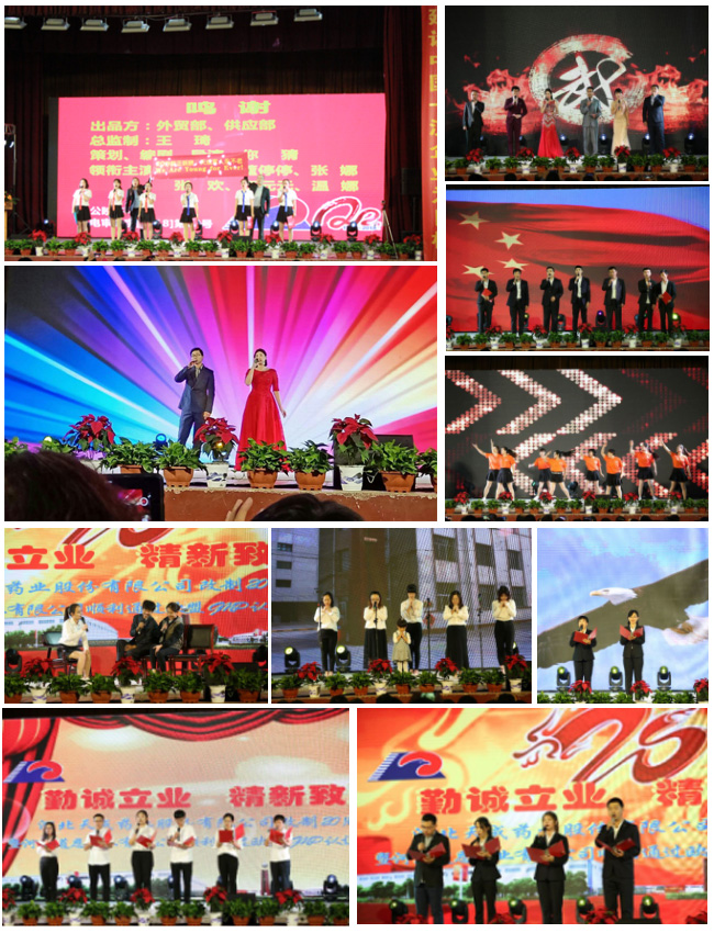 <節(jié)目名稱按圖片排列順序>1.外貿(mào)部、供應(yīng)部演繹《絕代風(fēng)華天成人》2.人力資源部和企管部合唱《天成人》3.渤海分公司合唱《真心英雄》4.輸液一車間舞蹈《美美噠》5.針劑一車間帶來(lái)的《走進(jìn)新時(shí)代》6.固體車間小品《昨天,今天,明天》7.銷售業(yè)務(wù)部、銷售服務(wù)部帶來(lái)手語(yǔ)表演《感恩的心》8.道恩藥業(yè)詩(shī)朗誦《如今,我們已長(zhǎng)大》9.銷售系統(tǒng)詩(shī)朗誦《改制20周年賀詞》10.生產(chǎn)、質(zhì)量系統(tǒng)詩(shī)朗誦《騰飛天成》